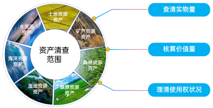 《工作方案》明確本次資產(chǎn)清查范圍為全民所有土地、礦產(chǎn)、森林、草原、濕地、水、海洋等7類自然資源資產(chǎn)。資產(chǎn)清查主要工作內(nèi)容包括:查清實(shí)物量、核算價(jià)值量、理清使用權(quán)狀況三項(xiàng)任務(wù)。