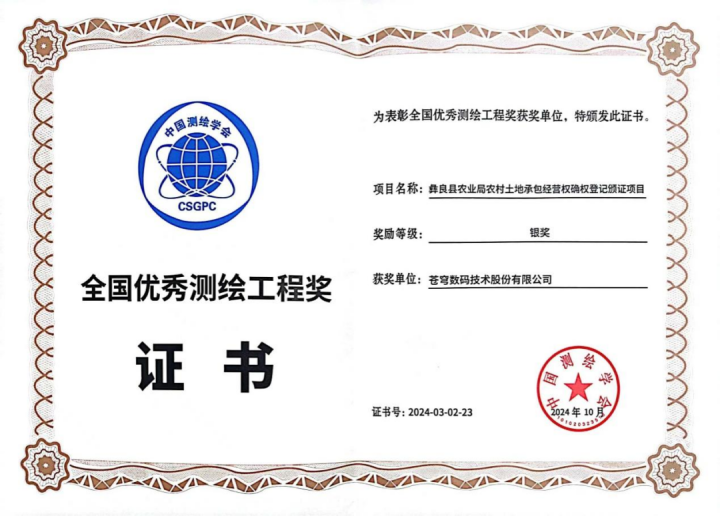 作為中國(guó)領(lǐng)先的地理信息開(kāi)發(fā)及服務(wù)商,蒼穹數(shù)碼于測(cè)繪地理信息領(lǐng)域持續(xù)深入耕耘,成績(jī)顯著。主導(dǎo)研發(fā)的“彝良縣農(nóng)業(yè)局農(nóng)村土地承包經(jīng)營(yíng)權(quán)確權(quán)登記頒證項(xiàng)目”,憑借嚴(yán)謹(jǐn)?shù)墓ぷ鲬B(tài)度、先進(jìn)的技術(shù)手段以及高質(zhì)量的成果展現(xiàn),榮膺“全國(guó)優(yōu)秀測(cè)繪工程銀獎(jiǎng)”。此項(xiàng)目的成功,不但彰顯了我們?cè)跍y(cè)繪工程領(lǐng)域的專業(yè)水平與卓越能力,而且是對(duì)保障農(nóng)村土地權(quán)益、助推農(nóng)業(yè)現(xiàn)代化發(fā)展方面所作貢獻(xiàn)的高度肯定。