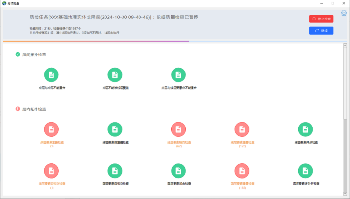 系統(tǒng)提供交互式質(zhì)檢能力,賦予用戶更加直觀、高效的質(zhì)檢體驗,支持對質(zhì)檢全過程的監(jiān)控與調(diào)度,允許用戶在質(zhì)檢進行中隨時暫?;蛑貑?,即時查看當前的質(zhì)檢情況,確保隨控隨檢、無遺漏。同時采用圖屬聯(lián)動的方式,對質(zhì)檢結(jié)果進行可視化定位以及以質(zhì)檢報告形式導出,實現(xiàn)質(zhì)檢全流程數(shù)據(jù)的可回溯。