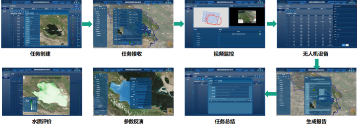集作業(yè)任務(wù)管理、數(shù)據(jù)管理、生態(tài)環(huán)境綜合分析、輔助決策、系統(tǒng)管理多功能于一體。采用無人機搭載高光譜載荷,結(jié)合地面光譜及水質(zhì)參數(shù)采集監(jiān)測手段獲取水質(zhì)狀況數(shù)據(jù),對湖區(qū)進行水環(huán)境質(zhì)量、水生生物、水體低質(zhì)、輻射環(huán)境、水質(zhì)遙感監(jiān)測以及周邊生態(tài)系統(tǒng)等精細化管理、統(tǒng)計、計算。