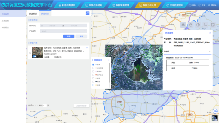 蒼穹數(shù)碼主導(dǎo)開發(fā)的防洪重點保護對象動態(tài)監(jiān)測模塊通過遙感技術(shù)監(jiān)測大汶河以及沂沭河流域內(nèi)的防洪重點保護對象,界定重點保護對象范圍,采用遙感影像信息提取技術(shù)或者基于采購的高時效性數(shù)據(jù)產(chǎn)品的方式,提取受洪水威脅的居民地、骨干交通(重要鐵路及公路干線)、工礦企業(yè)(大型骨干企業(yè)和工礦區(qū))、重要水利工程、農(nóng)田等作為防洪重點保護對象的空間范圍。