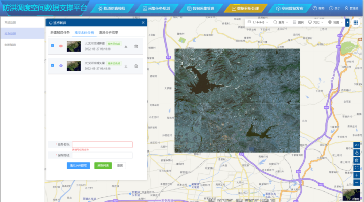 本功能通過判斷閾值的水指數(shù)算法開發(fā)了水體提取模型,利用SAR影像提取防洪重點區(qū)域的水體信息,并通過判對比分析不同時期的水體邊界范圍,提取水體的淹沒范圍,為汛期的防洪應(yīng)急監(jiān)測提供數(shù)據(jù)支撐。