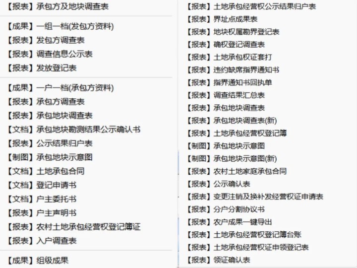 軟件可以按照國(guó)家、省市級(jí)數(shù)據(jù)標(biāo)準(zhǔn)要求,導(dǎo)出承包方調(diào)查表、發(fā)包方調(diào)查表、公示結(jié)果歸戶表、土地承包經(jīng)營(yíng)權(quán)證套打、調(diào)查信息公示表、土地承包合同、農(nóng)村土地承包經(jīng)營(yíng)權(quán)證登記簿、承包地塊調(diào)查表等國(guó)標(biāo)報(bào)表。