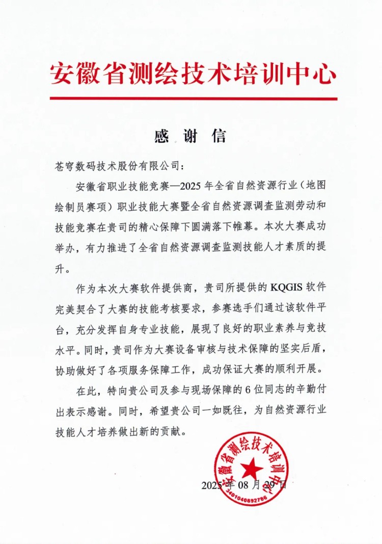 近日,安徽省測(cè)繪技術(shù)培訓(xùn)中心發(fā)來的感謝信,為蒼穹數(shù)碼技術(shù)股份有限公司在安徽自然資源領(lǐng)域的深耕歷程再添濃墨重彩的一筆。這封感謝信不僅是對(duì)蒼穹數(shù)碼助力安徽省自然資源行業(yè)技能大賽圓滿落幕的高度認(rèn)可,更是對(duì)其長(zhǎng)期以 “技術(shù)創(chuàng)新 + 專業(yè)服務(wù)” 雙引擎驅(qū)動(dòng)行業(yè)發(fā)展的生動(dòng)見證,彰顯了雙方深度合作的堅(jiān)實(shí)成果。