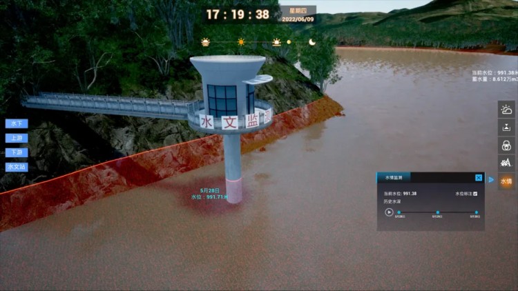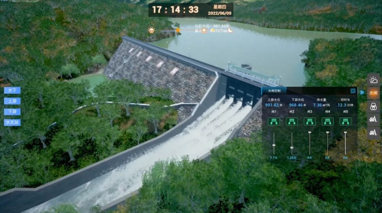 采用動態(tài)渲染技術(shù),模擬仿真閘門啟閉、泄水及流量變化過程。與閘門自動控制系統(tǒng)對接,遠(yuǎn)程控制閘門啟閉,達(dá)到水利工程運(yùn)行的虛實(shí)交互。采用動態(tài)渲染技術(shù),模擬仿真閘門啟閉、泄水及流量變化過程。