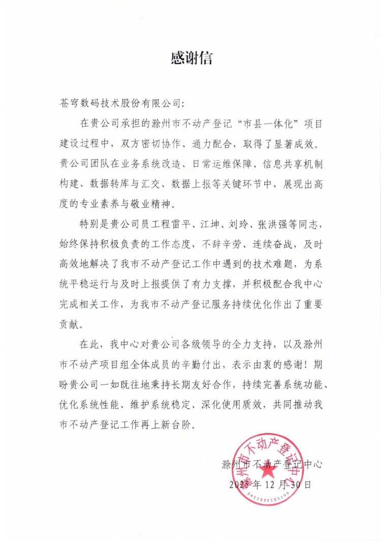 2025年12月30日,收到來自滁州市不動(dòng)產(chǎn)登記中心的感謝信,信中對項(xiàng)目團(tuán)隊(duì)的專業(yè)素養(yǎng)和敬業(yè)精神表示了高度贊揚(yáng)和衷心感謝。所獲榮譽(yù),皆為前行奮進(jìn)的動(dòng)力,蒼穹數(shù)碼將持續(xù)服務(wù)滁州市不動(dòng)產(chǎn)登記中心讓技術(shù)底座更穩(wěn)固、讓服務(wù)觸角更延伸,切實(shí)守護(hù)“亭城”萬家燈火安居夢,也將不斷優(yōu)化打磨不動(dòng)產(chǎn)登記系列產(chǎn)品,為經(jīng)濟(jì)社會(huì)高質(zhì)量發(fā)展貢獻(xiàn)更多登記力量!