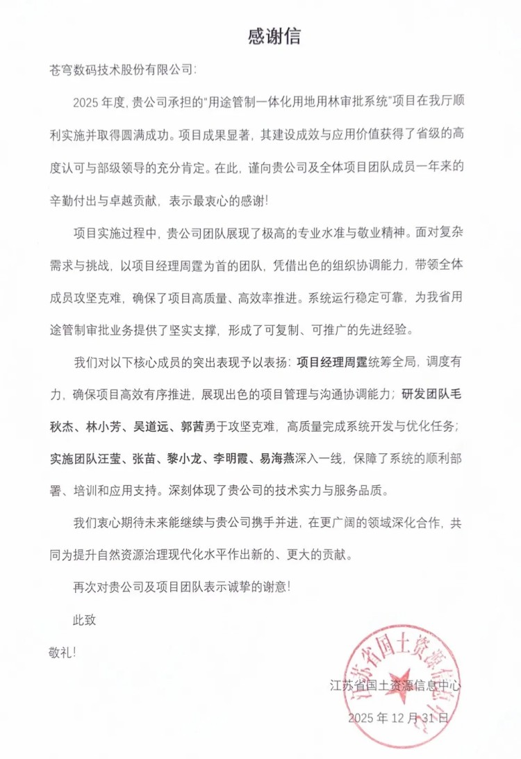 新舊序章,復(fù)盤恰宜。一封封滿載贊許的感謝信紛至沓來,近日,蒼穹數(shù)碼技術(shù)股份有限公司收到一封來自江蘇省國土資源信息中心的感謝信,對公司及項目團隊成員在江蘇省“用途管制一體化用地用林審批系統(tǒng)”項目中的辛勤付出和卓越貢獻,表示最衷心的感謝!